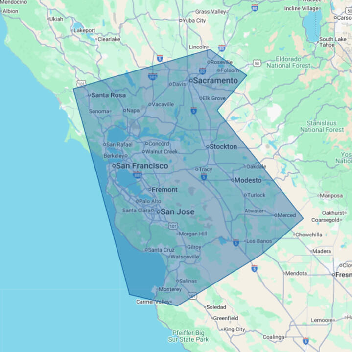 Our core service is the San Francisco Bay Area, with regular service throughout the Oakland / East Bay Area and the Peninsula.We also service inland to the Sacramento area, the North Bay as far as Santa Rosa, and south as far as Salinas and Merced upon request.